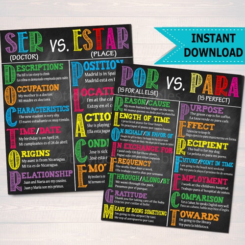 Spanish Classroom Poster Set Decor Ser Vs Estar Por Vs Para Etsy Uk